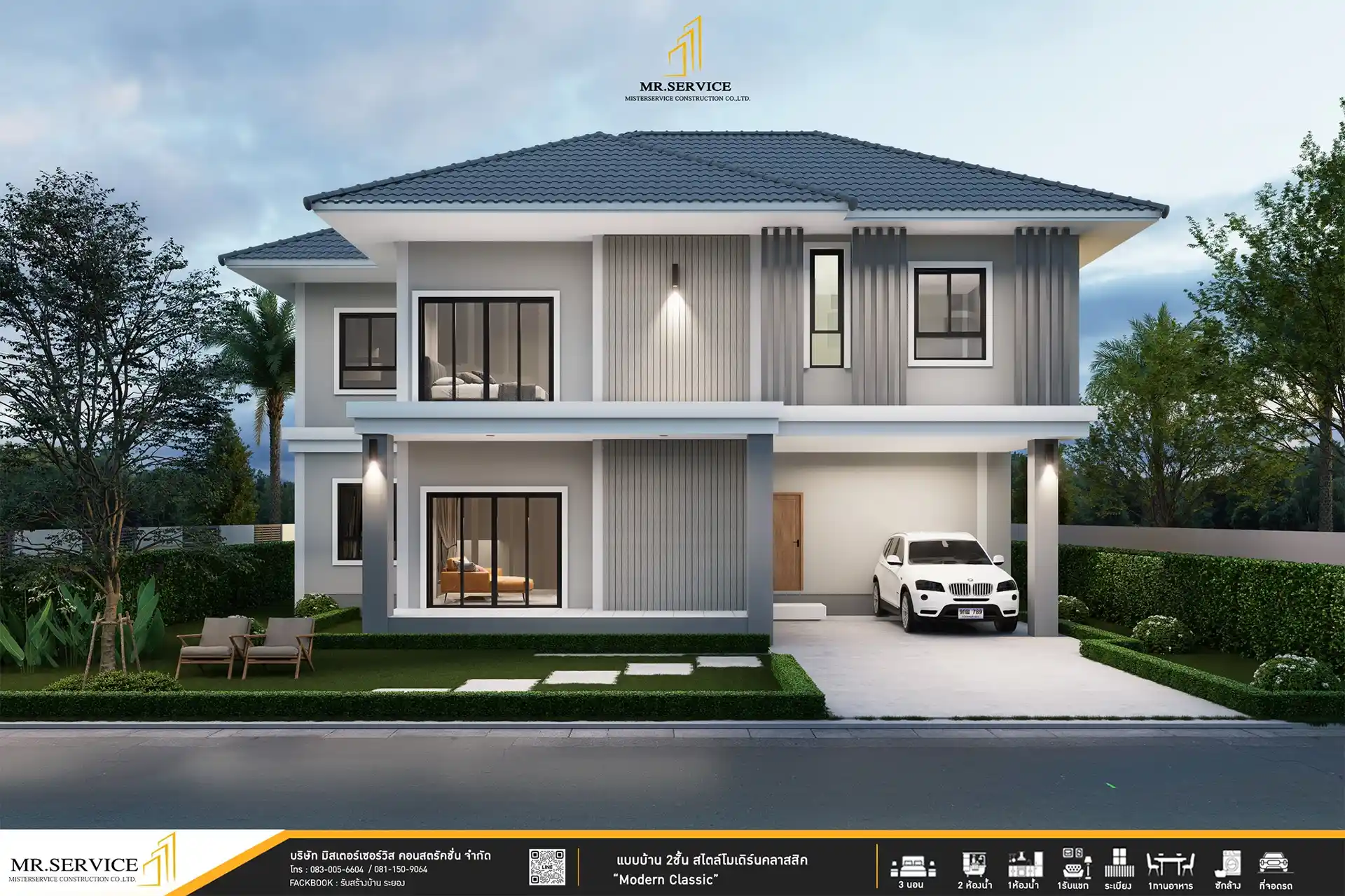 MR-18 – บ้านสองชั้นสไตล์ Modern Classic พื้นที่ใช้สอย 280 ตร.ม. โดดเด่นด้วยดีไซน์เรียบหรูและฟังก์ชันครบครัน 3 ห้องนอน 2 ห้องน้ำ พร้อมห้องรับแขก ห้องครัว พื้นที่ซักล้าง และที่จอดรถ เชื่อมต่อทุกพื้นที่อย่างลงตัว เหมาะสำหรับครอบครัวที่ต้องการความสะดวกสบายและความเป็นส่วนตัวในทุกมุมของบ้าน