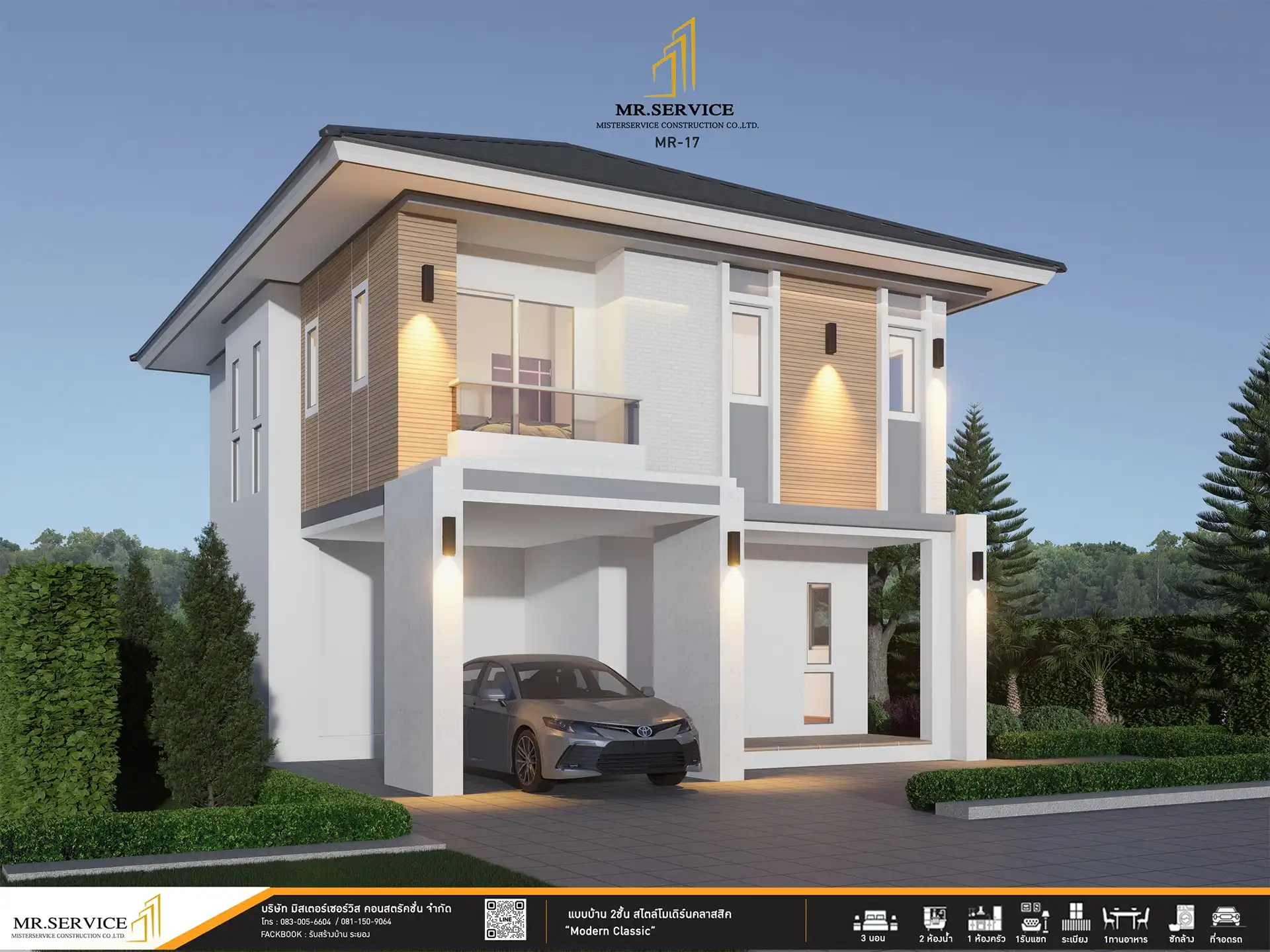 MR-17 แบบบ้าน ‘Modern Classic’ ที่ออกแบบมาเพื่อครอบครัวเล็กๆ โดยเฉพาะ… ลงตัวด้วยดีไซน์ที่ผสมผสานความทันสมัยและความอบอุ่นได้อย่างลงตัว ครบครันด้วย 3 ห้องนอน 2 ห้องน้ำ และพื้นที่ใช้สอย 250 ตร.ม. พร้อมพื้นที่จอดรถ และฟังก์ชันครบครัน ตอบโจทย์ทุกการใช้ชีวิตในแบบที่คุณต้องการ